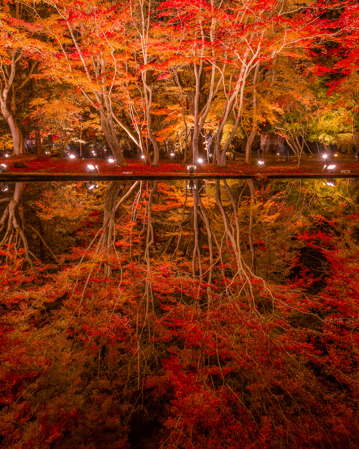 逆さ紅葉の幻想的な世界です。水面が波立たないように水面の高さを低くして、綺麗に見えるように毎日落ち葉を清掃してくれる関係者の方に感謝致します。ここ数年はコロナで開催出来てませんが今年は久しぶりに幻想的な世界を見に行けたらと願ってます。